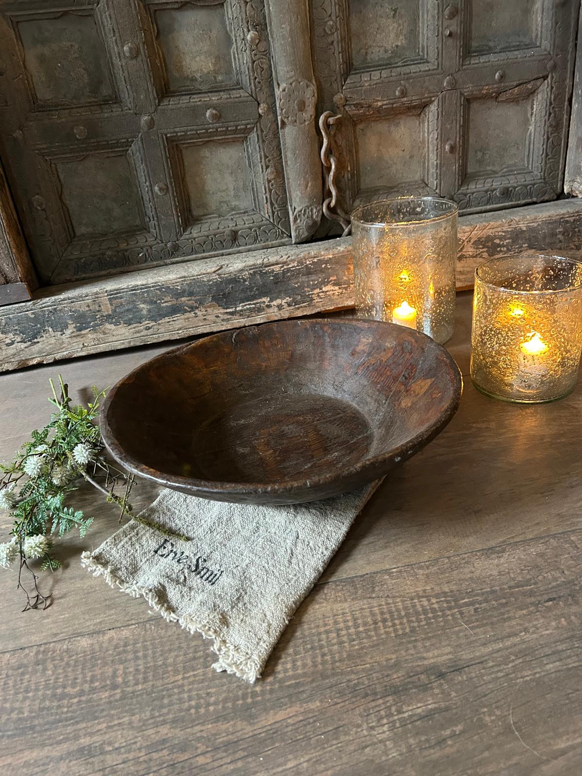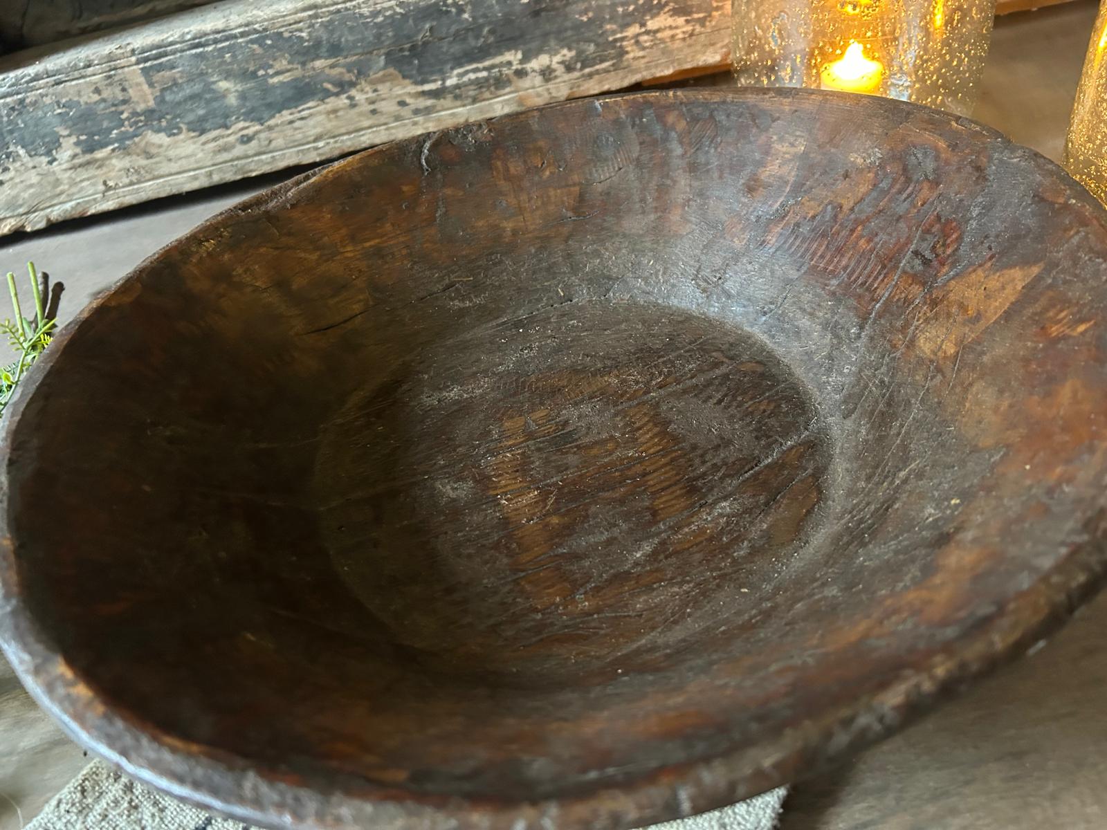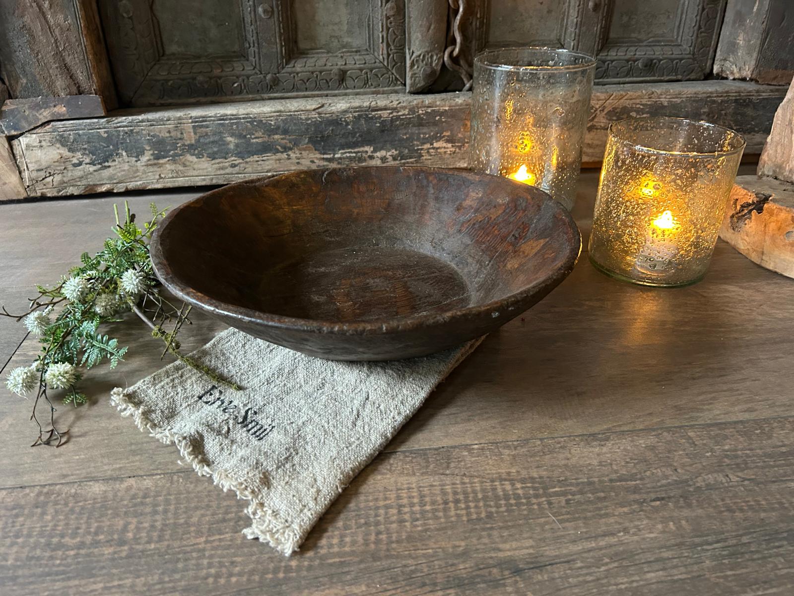 Met deze oude houten schaal haal je een decoratief en karaktervol woonaccessoire in huis dat warmte, rust en sfeer toevoegt aan je interieur.