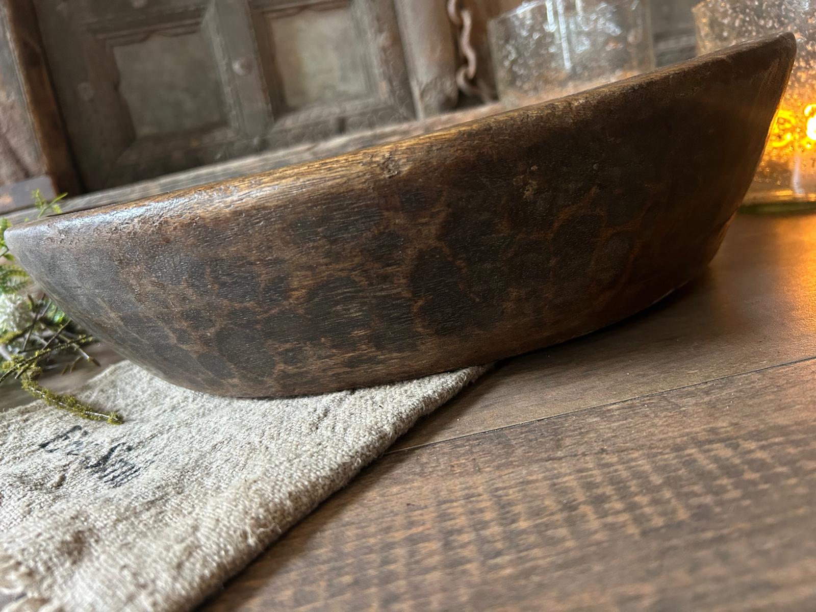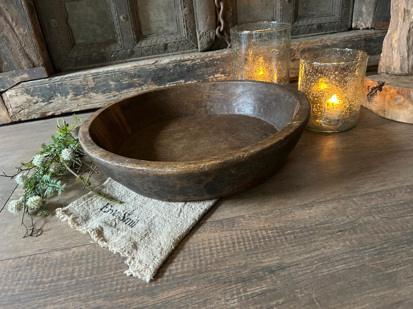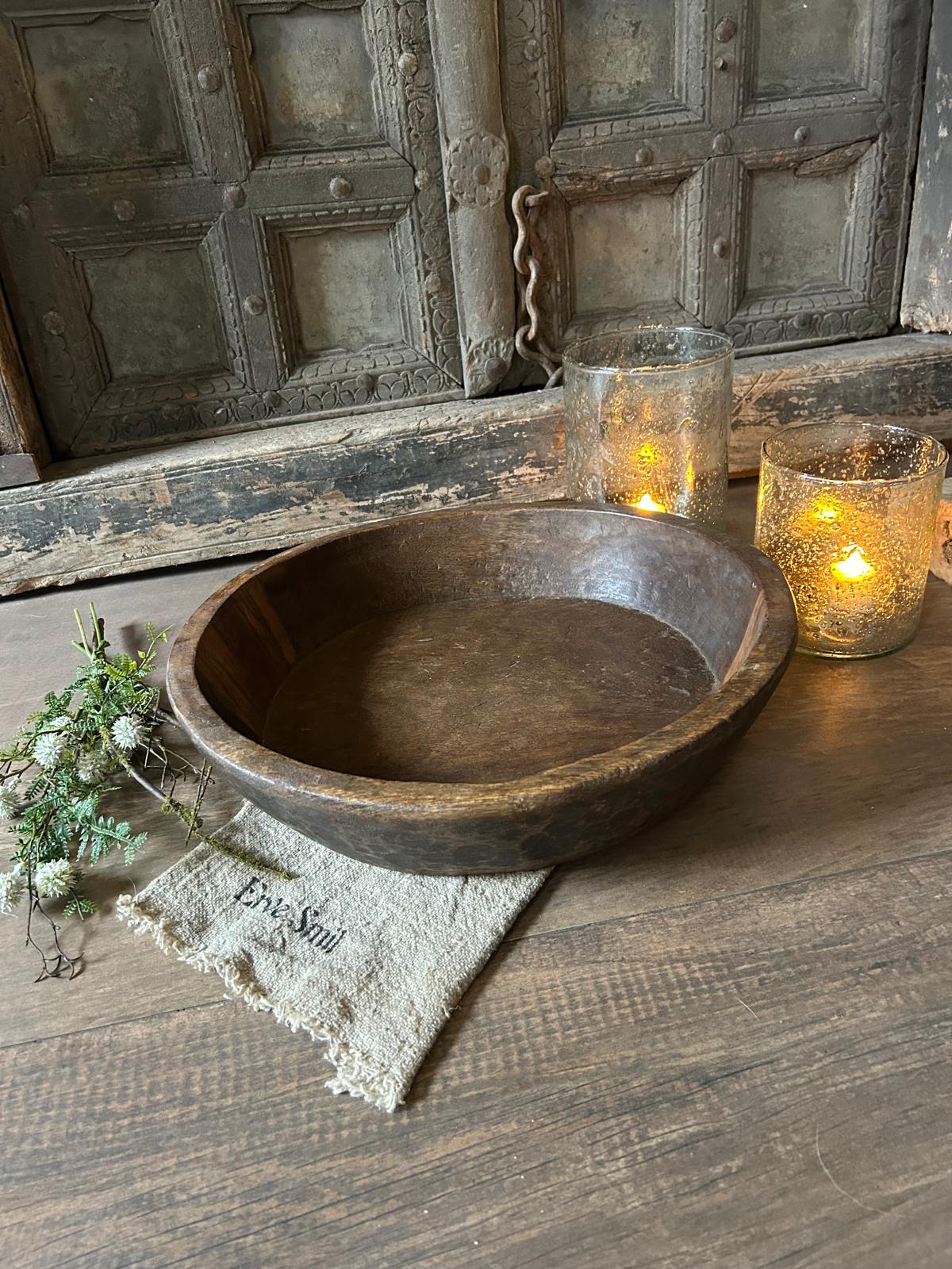 Met deze oude houten schaal haal je een decoratief en karaktervol woonaccessoire in huis dat warmte, rust en sfeer toevoegt aan je interieur.