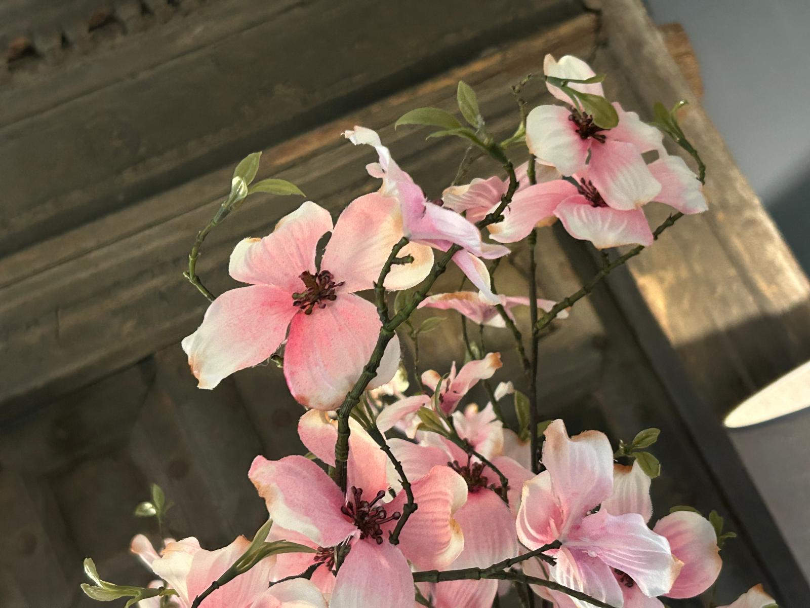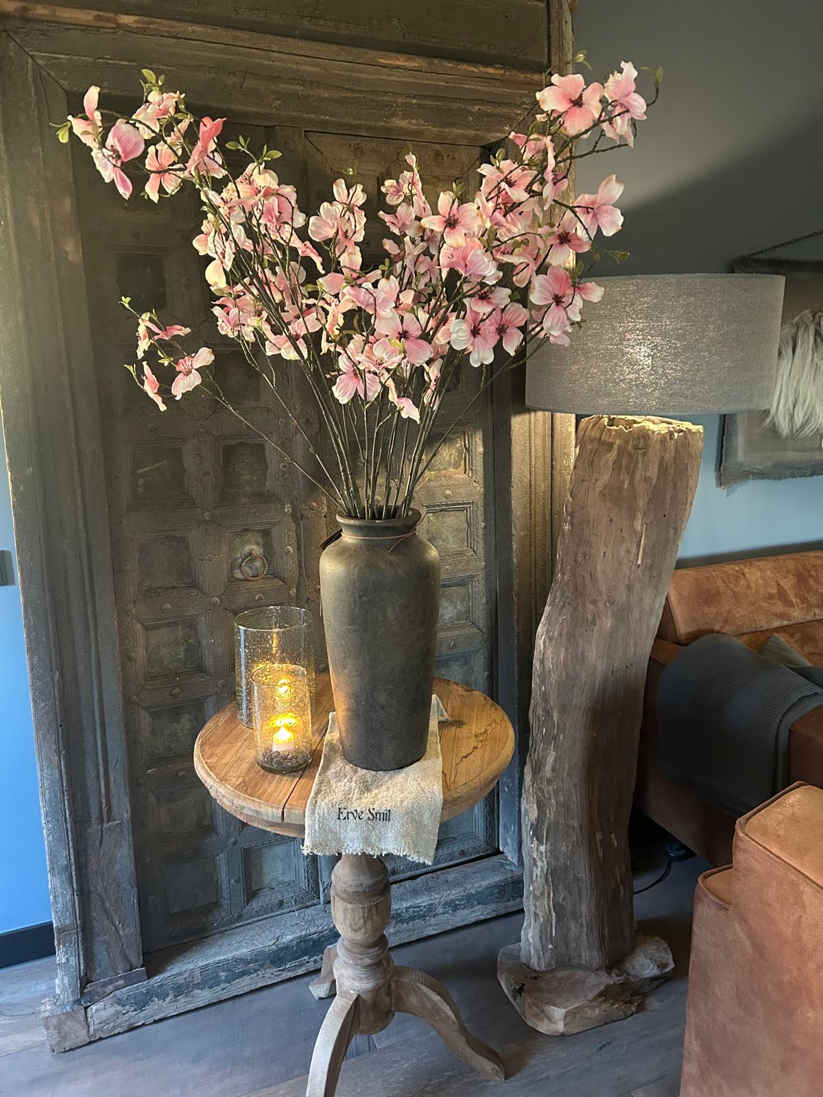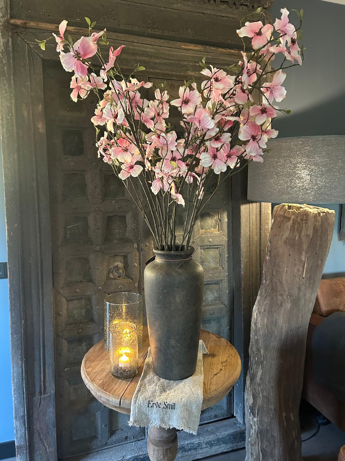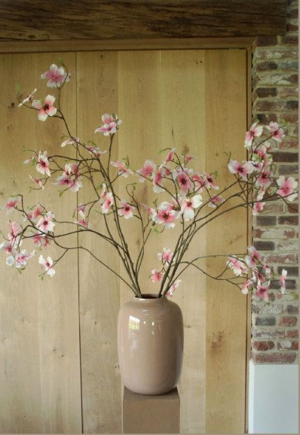 De zachte roze kleur van deze Cornus tak brengt direct warmte en charme in huis. In combinatie met houten meubels, robuuste tafels, linnen accessoires en aardewerk potten komt de landelijke sfeer volledig tot zijn recht.