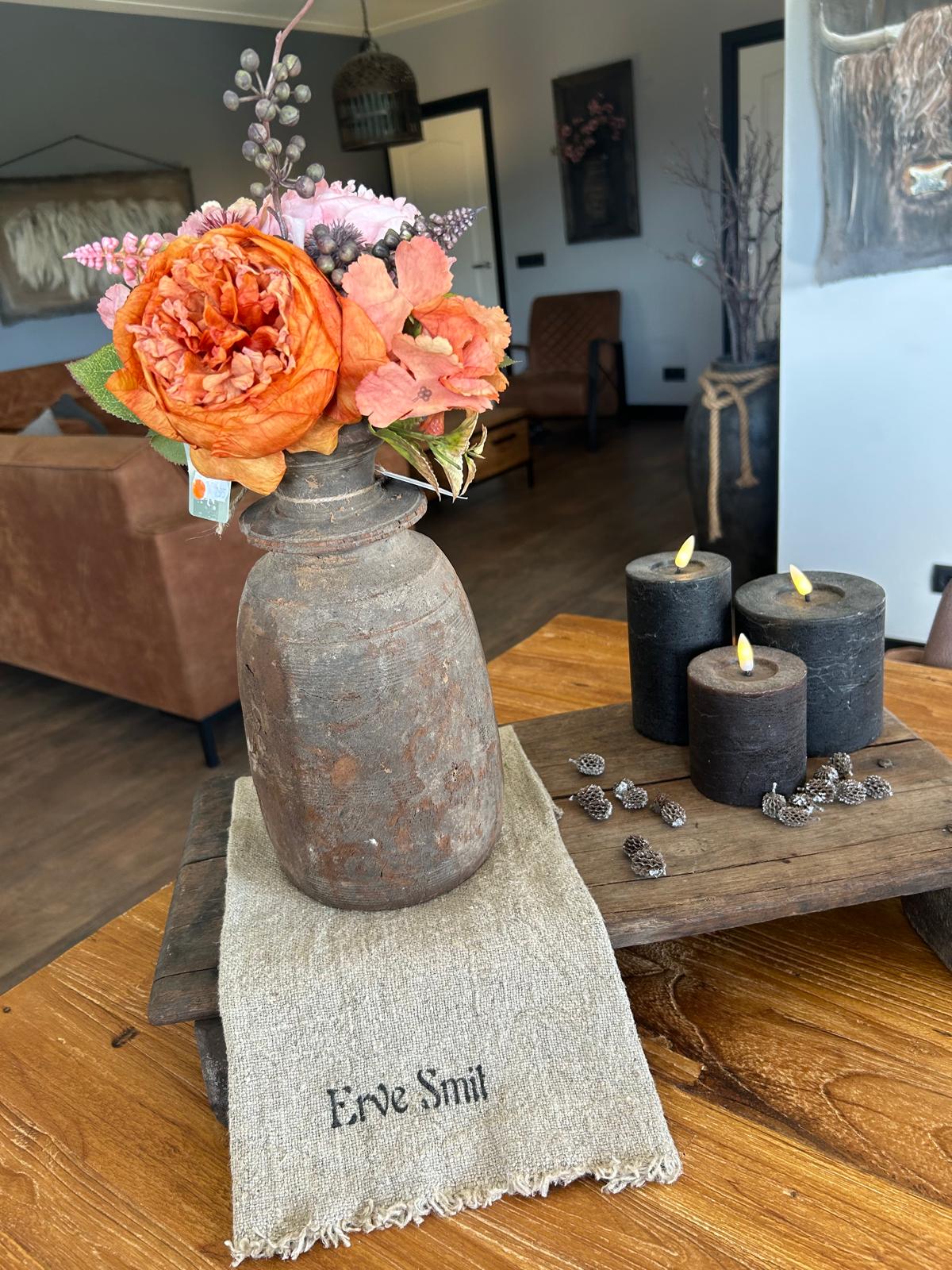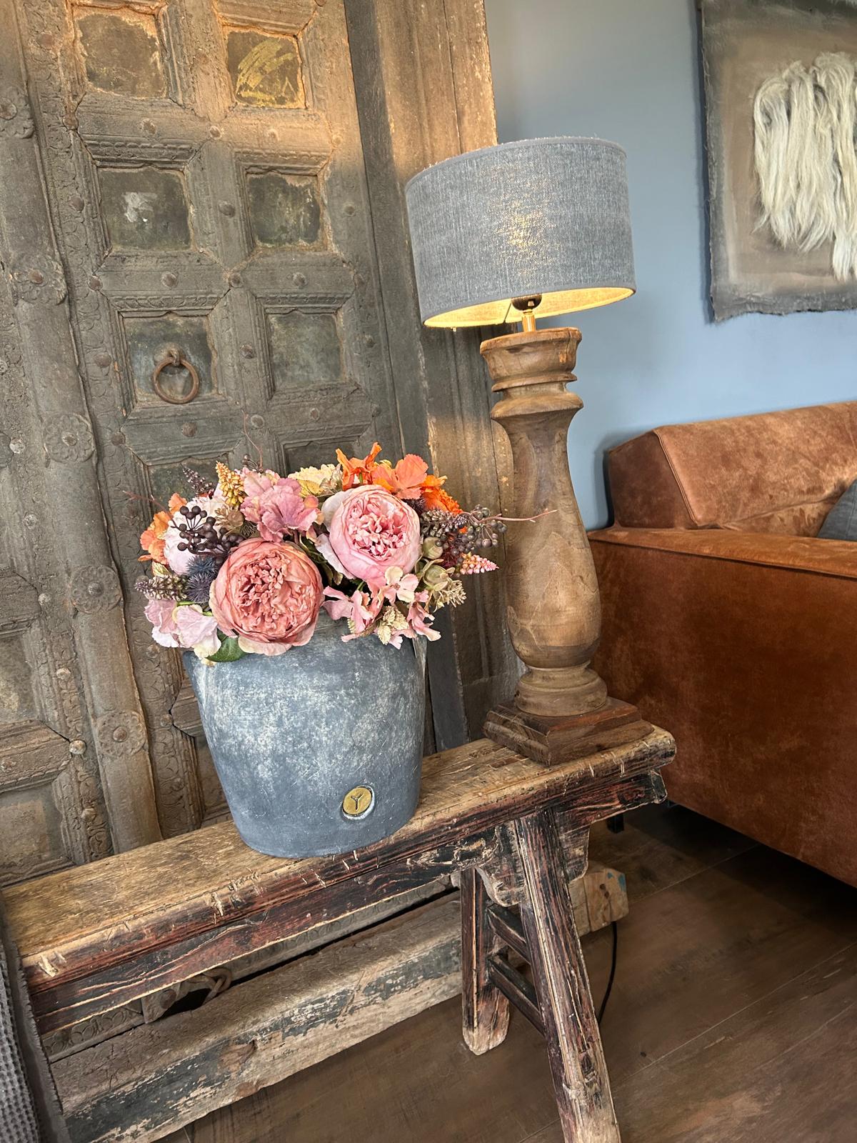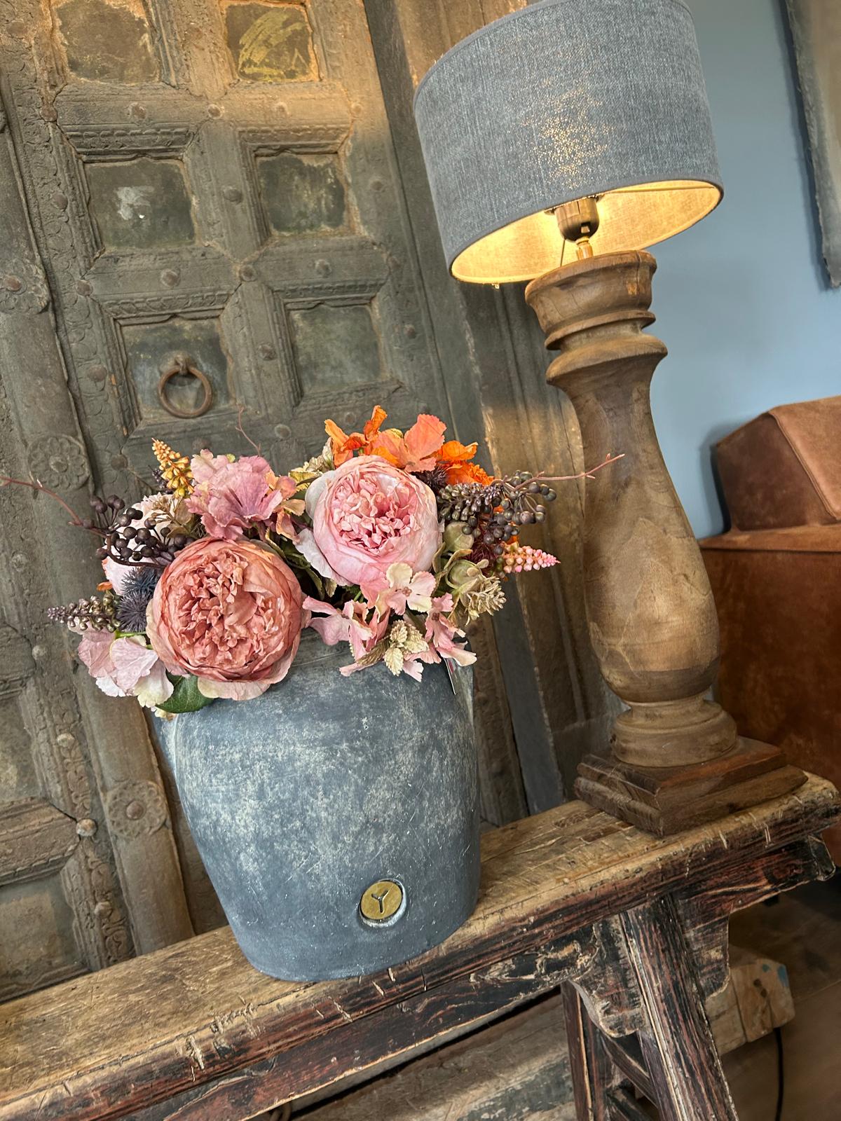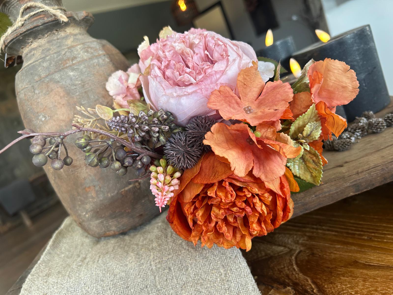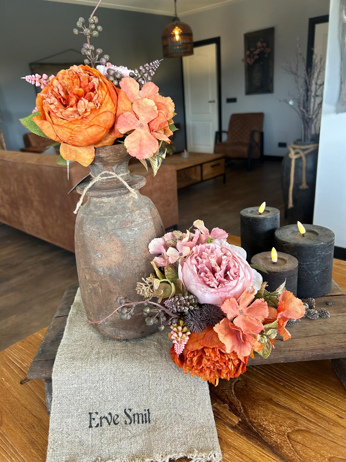 Op de productfoto is te zien hoe je dit boeketje ook kunt combineren voor een nog rijker effect. In de afgebeelde pot zijn 4 boeketjes verwerkt, bestaande uit 2 oranje en 2 roze varianten. Door meerdere boeketjes samen te voegen, ontstaat er een volle, luxe en extra sfeervolle decoratie die perfect past binnen een landelijke woonstijl.