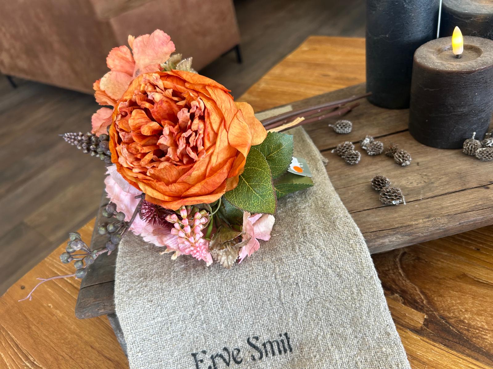De warme oranje tinten van dit pioenroos boeketje zorgen voor een gezellige, uitnodigende sfeer. Of je het nu plaatst op de eettafel, in de vensterbank, op een dressoir of in een landelijke kast – dit boeketje trekt direct de aandacht en geeft elke ruimte een sfeervol en stijlvol karakter.