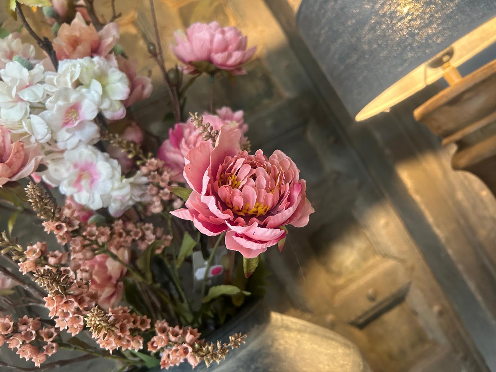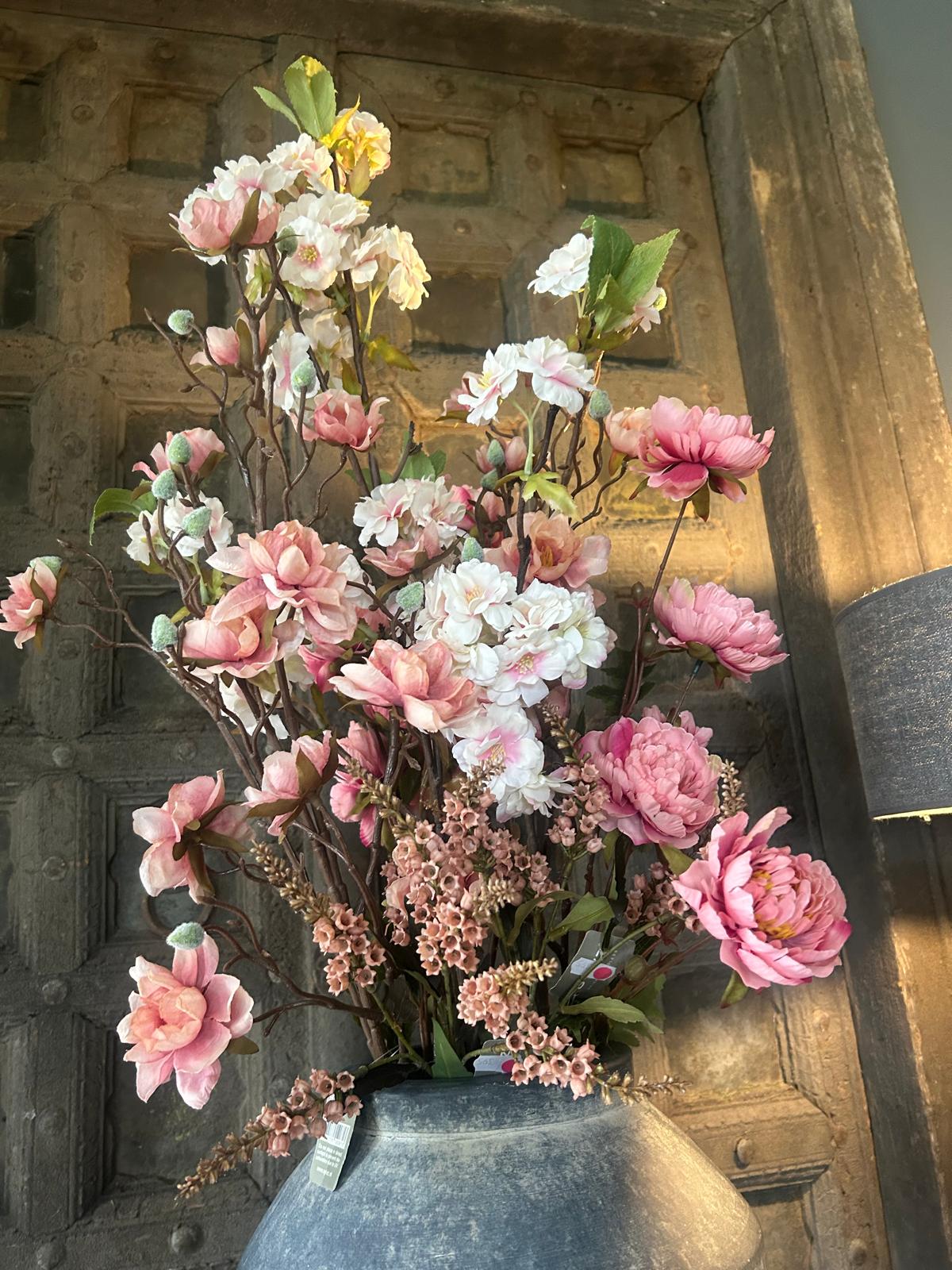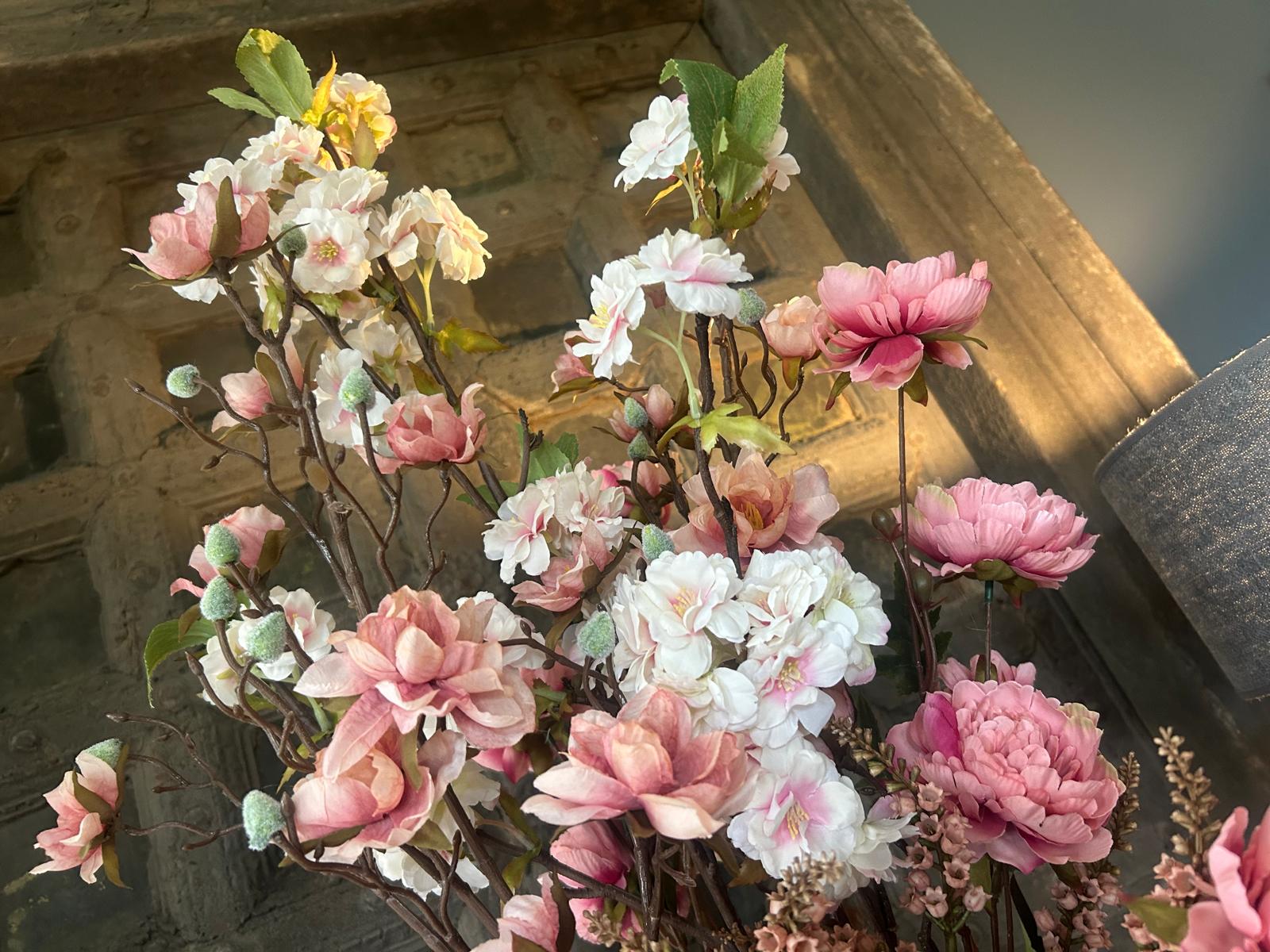 Met dit voorjaars boeket kunst bloemen geniet je het hele jaar door van een frisse, bloeiende uitstraling in jouw landelijke sfeer interieur.